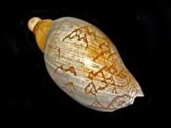 Shells of Livonia mammilla can reach a size of 100–303 millimetres (3.9–11.9 in).[3] These large shells are characterized by a greatly swollen apex and a lightweight protoconch with a diameter of about 20 millimetres (0.79 in). Whorls are smooth and rounded, with axial growth lines and weak spiral grooves on the top of the body whorl. Columella shows four plaits and the outer lip is smooth and flared outwards. The background colour is yellowish-brown or cream, while the inner edge of outer lip may be white or orange. Body whorl usually has two wide spiral bands of axial zigzag brown lines, but this pattern is variable.[5]