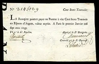 ![]() La Banque Royale: 100 livres Tournois (1720) | |