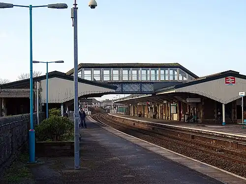 Llanelli railway station is the railway station serving the town of Llanelli, Carmarthenshire, Wales. It is located on the West Wales line and the Heart of Wales line 225 miles 20 chains (362.5 km) from the zero point at London Paddington, measured via Stroud.[1] The station and the majority of trains calling are operated by Transport for Wales.