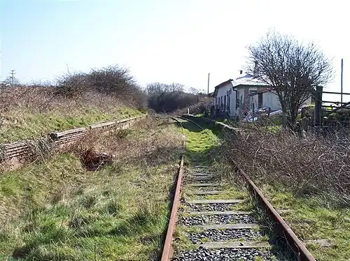 Llangwyllog railway station was situated on the Anglesey Central Railway line from Gaerwen to Amlwch. The line between Llangefni and Llanerchymedd opened on 1 February 1866, Llangwyllog station opened the same day.[2][3] The single storey station building with ticket and waiting room was located on the Down (west) side the platform being extended in 1890. A small goods shed was located north of the main building.[4] In 1914 a passing loop was installed at the station, the only one of the whole Anglesey Central line. Another platform was also installed in the year on the opposite side of the line which had a wooden shelter on it.[5]