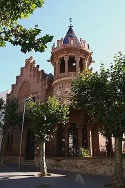 | 1884–1885 | Ateneu de Canet de Mar[32] | Riera Sant Domènec, 1A | The building, on the site of an old house, has served as the headquarters of several of the town's political and cultural associations. Building of conservative lines with wrought iron railings, abundant reddish sgraffito and a rose window containing stained glass. A notable feature is the chamfered corner with its dome and the lightning conductor in the form of a wrought-iron dragon. It currently houses the Canet public library. | Very good | |