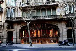 | 1902 | Casa Lleó Morera[24] | Passeig de Gràcia, 35 | Remodelling of the former casa Rocamora of 1864. It contains rich ornamentation by Lluís Brú i Salelles in mosaics, Antoni Serra i Fiter in ceramics, Antoni Rigalt i Blanch in stained glass, with furniture and joinery by Gaspar Homar i Mezquida and Josep Pey i Farriol, as well as sculptures by Eusebi Arnau i Mascort. | Fair |