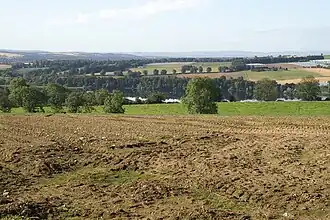 Fields above Kinloch, with the Loch of Drumellie or Marlee Loch through the trees.
