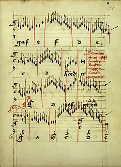 The main scrivener was some friar Jodocus of Windsheim, who is thought to have been a student of the school of the Nuremberg organist and composer Conrad Paumann. The bulk of the collection dates from the years 1451 to 1453; supplements were added until 1460.[3] The collection shows the increasing value of secular songs, along with sacred ones, including "All mein’ Gedanken, die ich hab" (All my thoughts that I have), "Ich fahr dahin" (I go away), "Der Wald hat sich entlaubet" (The forest is leafless) and "Ich spring an diesem Ringe" (I jump in this circle). Individual songs can be assigned to authors of late medieval manuscripts, namely the Monk of Salzburg and Oswald von Wolkenstein ("Wach auf, mein Hort", Wake up, my darling").[1] The second part of the manuscript, titled Fundamentum organisandi, includes 31 organ tablatures by Conrad Paumann.[1] The two parts, created independently, were combined soon after their origin.