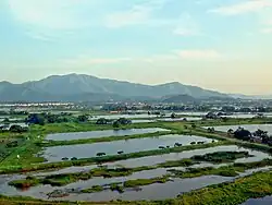 Most of the area in Lok Ma Chau is wetland. The Kai Kung Leng mountain range of Hong Kong is visible in the background.