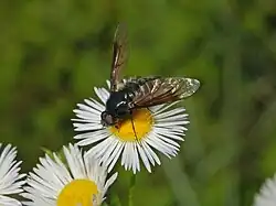The adults grow up to 10–13 millimetres (0.39–0.51 in) long. Body is shining black. In males the thorax shows black hairs, tawny in females. The wings have a wide brown band close to costal margin. The abdomen is black, with yellow bord of the segments, except the first segment.[4]