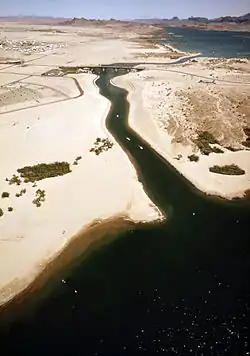 The bridge was not rebuilt over a river, but was put up on land between the main part of the city and Pittsburgh Point, which at that time was a peninsula jutting into Lake Havasu.[14] Once completed, a construction company dredged the Bridgewater Channel Canal under the bridge, across the neck of the Pittsburgh Point peninsula. The canal separating it from the city made Pittsburgh Point an island. As a result, the bridge now traverses a navigable shortcut between the Thompson Bay in Lake Havasu, south of Pittsburgh Point, and the northern part of Lake Havasu.[15]