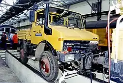 In 1983 and 1986, London Underground purchased two Unimog road-rail vehicles, which were used as depot shunters. They are fitted with small railway wheels just outside the road tyres, which can be lowered when working in railway mode, and ensure that the road wheels run along the top of the rails. They are numbered L84 and L85.[21] They previously owned a Unimog tractor-trailer pair of vehicles, purchased in 1982, which were used for leaf-clearing duties. Nozzles on the tractor unit were used to suck up the leaves, which were then stored in a 570-cubic-foot (16 m3) bin mounted in the trailer.[11]
