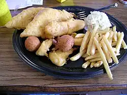 A typical meal from Long John Silver's: a platter with battered and fried fish and chicken, french fries, battered fried shrimp, hushpuppies and coleslaw