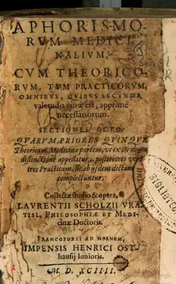 - Consiliorum Medicinalium, conscriptum a praestantiss. atque exercitatiss. nostrorum temporum medicis, liber singulis.... Nunc primum studio & opera, Laurentii Scholzii a Rozenaw med. Vratisl. hoc modo in lucem editus. Frankfurt: Apud Andreae Wecheli haeredes, Claudium Marnium & Joan. Aubrium, 1598 (VD 16 S 3825).
