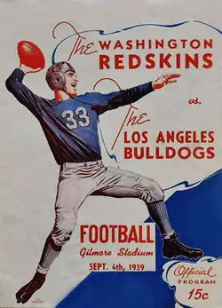 The Los Angeles Bulldogs were a professional American football team that competed from 1936 to 1948 (the last year as the Long Beach Bulldogs). Formed with the intention of joining the National Football League in 1937 (and turned down in favor of the Cleveland Rams), the Bulldogs were the first team on the major league level to play its home games on the American West Coast (the NFL's Los Angeles Buccaneers and the first AFL's Wildcats of 1926 were actually traveling teams based in Chicago). They were considered "the best football team in existence outside the NFL".[1]