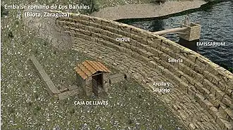 - ^ ANDREU, J., ARMENDÁRIZ, J., y PERÉX, Mª J.: "La presa romana de Cubalmena (Biota, Zaragoza) y el abastecimiento de agua a la ciudad de Los Bañales"], en BARATTE, F., ROBIN, CH. J., y ROCCA, E. (eds.): Regards croisés d'Orient et d'Occident: las barrages dans l'Antiquité Tardive, París, 2013, pp. 189-216.