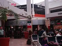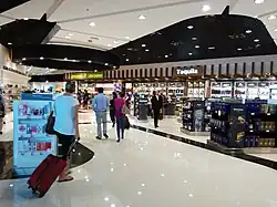 Terminal 1, covering an area of 16,580 square metres (178,500 sq ft), houses arrival and departure facilities for domestic flights within a single-story building. It features a distinctive roof over the departures concourse with peaked white structures. The arrivals area includes a baggage claim, car rental services, taxi stands, snack bars, and souvenir shops. The departures section includes a check-in area, a security checkpoint, and a concourse with a food court and eight gates on the ground level, allowing passengers to walk to their aircraft. A mezzanine level, housing a VIP lounge, is accessible from the departure concourse.[8]
