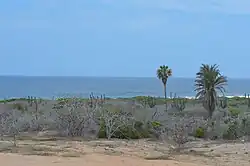 The Río San José stops just shy of the ocean, with a one km long sand bar creating an estuary, the third largest in Mexico.[20] This pooling of brackish water has created an oasis in the surrounding Sarcocaule desert. The Río San José flows largely underground for 40 miles (64 km) from its origin in the Sierra de la Laguna (Laguna Mountains), although its Miramonte River tributary adds almost an additional 10 miles (16 km). Its tributaries flow down the eastern side of the sierra and include Santa Rosa, Santa Lázaro, San Miguel, San Ignacio (at La Palma), Caduaño, Miraflores and San Bernard.[21]