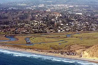 Los Peñasquitos Marsh Natural Preserve and Lagoon is a coastal marsh in San Diego County, California, United States situated at the northern edge of the City of San Diego, forming the natural border with Del Mar, California.[1] This bar-built estuary divides a colony of the endangered Torrey pine on a narrow coastal strip.[2] Three streams empty into the lagoon: Carroll Creek, Carmel Creek, and Los Peñasquitos Creek, with a total drainage basin area of 95 square miles.[3]