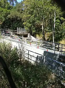 In 1929 Stanford installed a diversion dam on Los Trancos Creek to its Felt Lake water storage reservoir. The dam, located just below the intersection of Arastradero and Alpine Roads, blocked access of anadromous steelhead trout (Oncorhynchus mykiss) to over 3 miles (4.8 km) of pristine upstream spawning grounds.[8] In 2009, Stanford University completed construction of a new fish screen and ladder as the previous fish ladder was an "Alaska Steep Pass" designed for much higher flows.[9] The upper watershed is wholly protected within the Los Trancos Open Space Preserve just northwest of Page Mill Road and east of Skyline Boulevard. Spawning steelhead in Los Trancos Creek below the Felt Lake diversion dam vary from zero in drought years to several hundreds in wetter years and occurs from February to April. Steelhead spend two years in freshwater before heading to the Bay and field studies in the Stanford portion of Los Trancos Creek have found hundreds of young trout ranging from ~140 per mile to nearly 600 per mile.[10]