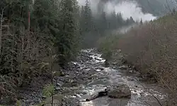 Loss Creek begins at an unnamed confluence at a point north of the settlement of Jordan River at an elevation of 507 metres (1,663 ft).[3] It flows west for 14 kilometres (8.7 mi), taking in the right tributaries Gain Creek and Noyse Creek, passing under Highway 14, and taking in the right tributary Jack Elliott Creek. It then turns south for 2 kilometres (1.2 mi), flows under a suspension bridge carrying the Juan de Fuca Marine Trail,[7] and ends at the Strait of Juan de Fuca on the Pacific Ocean, east of Sombrio Point[8] and south east of the settlement of Port Renfrew.[1][2][4] The average slope is 3.2% over 16 km (507m/16000m=0.03169). Rapids of 12% slope exist near the mouth of the tributary Gain Creek. The steeper the slope the higher the uplift versus erosion. This indicates an anomaly of uplift compared to the rest of the valley.