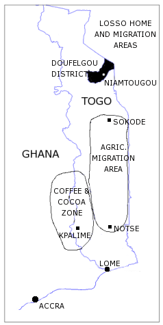 "Losso" is a name used to refer normally to both Lambas and Nawdba. To refer to someone who is not a Nawda,they use the word Lama. The origin of the name "Losso" or "Lossotu" is unclear and may have its origins in the name that their Kabyé neighbors called them. Confusion arose and has continued when the name "Losso" was attributed by Togo's French colonial administrations to all residents of what is now the Doufelgou District, regardless of their ethnic or linguistic affiliation. That is to say that an entire ethnic group is now being referred to by a name that has no meaning and makes no sense to them because of colonial practices of broad generalization and categorization. Residents of Yaka, Agbandé, Kadjalla, Alloum, Léon, Défalé, Massédéna, Pouda, and other villages in the Doufelgou District speak languages generally classified together as Lamba, but have also been called Losso by the colonial administration. While there has been considerable mutual influence between the Nawdba and their closest neighbors, the Kabyé and the Lambas, their languages do not resemble each other and are not mutually intelligible.