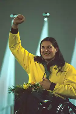 Sauvage was the Australian Paralympian of the Year in 1994, 1996, 1997 and 1998.[22] She was also the Australian Institute of Sport (AIS) Athlete of the year in 1997 and in 2001 inducted into the AIS 'Best of the Best'.[31] In 1998, she won the Australian of the Year Award in the ABIGGRIUOP National Sports Award category.[22] In 2000, Sauvage was named the Female Athlete of the Year in the Sport Australia Awards.[3] In 2000, she was named the "World Sportsperson of the Year with a Disability" at the first Laureus Sports Awards held in Monte Carlo.[4] In 1999 and 2000, she was named the International Female Athlete of the Year.[22] She was awarded the Australian Sports Medal in 2000.[32]