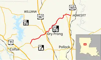 La 123—From a junction with La 8 northeast of Colfax through or near Dry Prong and Breezy Hill to a junction with La-US 165.