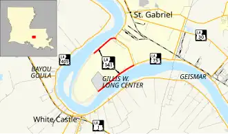 At this time, the route was still continuous, looping off of what was then LA 30.[11] In the mid-1960s, LA 30 was moved onto a new alignment set back from the river between Baton Rouge and St. Gabriel.[12][13] LA 75 was extended over the former alignment, replacing LA 30 as both the northern and southern terminus of LA 141.[12][13]