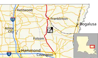 La 25—From a junction with La-US 190 at or near Chinchuba through or near Covington, Folsom and Franklinton to the Mississippi State Line near Warnerton.[12]