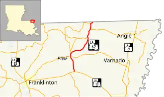 The route connects the small rural communities of Pine and State Line with LA 10, the main east–west route through Washington Parish. LA 10 leads to Bogalusa, the parish's largest city, as well as Franklinton, the parish seat. LA 62 follows a slightly winding route from southwest to northeast, but it serves a generally north–south function and is bannered accordingly.