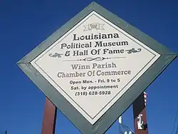 The Louisiana Political Museum and Hall of Fame is a museum and hall of fame located in Winnfield, Louisiana. Created by a 1987 act[1] of the Louisiana State Legislature, it honors the best-known politicians and political journalists in the state.