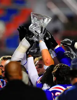 Holtz's first season in 2013 saw the Bulldogs move from the WAC to Conference USA.[94] The 2013 campaign was a rebuilding year for the Bulldogs, finishing the season with a 4–8 record.[95] However, the following season would see a big improvement. Holtz's 2014 Bulldogs went on to finish first in C-USA West at 9–5,[96] with a 35–18 win over Illinois in the Heart of Dallas Bowl.[97] In 2015 the Bulldogs continued their success, finishing 9–4[98] and winning the New Orleans Bowl over Arkansas State, 47–28.[99] The 2016 Bulldogs finished with a 9–5 record[100] and the C-USA West Division title, ultimately losing against East Division champion Western Kentucky in the conference championship game.[101] Tech finish the season with their third consecutive bowl victory, defeating Navy in the Armed Forces Bowl by kicking a late field goal to win 48–45.[102] In 2017 Louisiana Tech handily defeated SMU in the Frisco Bowl 51–10 in Frisco, Texas, extending their bowl winning streak to 4. Tech's fifth consecutive bowl win was in 2018 when the Bulldogs defeated Hawaii in the Hawaii Bowl 31–14. In 2019, the Bulldogs finished 10–3 and continued the FBS's longest bowl winning streak at 6 with another victory over a P5 team in the Independence Bowl, defeating Miami, 14–0. It was the first G5 shutout of a P5 team ever in a bowl game, as well as the first shutout in the Independence Bowl's 40+ year history. The Bulldogs went 5–5 in 2020, finishing with a 38–3 loss to Georgia Southern in the New Orleans Bowl. Holtz was fired after the 2021 season when the Bulldogs finished 3–9.[103] He ended his tenure in Ruston with a 64–50 record, and 6 bowl victories.[104]