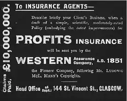 It is likely that Ludovic Mann began his career as an accountant at his fathers business, John Mann and Sons, an insurance broker that was founded in 1886. His early career would have involved further training in accountancy, training in insurance.[11] and actuarial science. In 1899, Mann invented consequential loss insurance then called consequential fire loss indemnity. Losses were calculated based on the turnover of the previous year that preceded the damage.[12] They were essentially contracts of indemnity which would compensate for losses occurring during a period of reduced turnover following the damage.[12] In 26 January 1900, Mann patented his invention and marketed it through the Canadian Western Assurance Company office in Glasgow.[10] The product would be later known as Consequential Loss Insurance or Profits Insurance.[12] In December 1907, he became the manager of the company branch office in Glasgow[10] where he continued to develop innovative insurance products. By 1910, he was still advertising the product that he was selling from the office of Western Assurance at 144 St. Vincent Street, Glasgow.[13] By 1925, Mann had become senior partner in Mann, Ballantyne and Co, Insurance Administrators and Brokers. This was an insurance company that had offices in Glasgow and London.[14][b] By 1950, Mann was chairman of Mann and Ballantyne.[11][10]