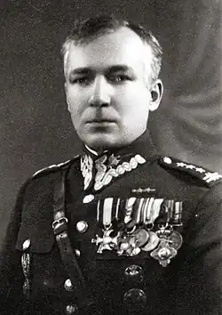 From October 1921 to October 1924, he was the deputy commander of the 11th Legions Uhlan Regiment in Ciechanów. From October 1924 to October 1925, he studied at the Higher Military School in Warsaw. In May 1926, during the coup d'état, he sided with Józef Piłsudski.[2] After completing the course, he was appointed chief of staff of the 2nd Cavalry Division in Warsaw. In September 1926, he was transferred to the Ministry of Military Affairs and appointed to the position of head of the General Department of the 2nd Cavalry Department.[3] On June 25, 1927, he was transferred to the Border Protection Corps and assigned to the command of the 5th KOP Brigade as an instructor officer.[4] On 21–24 March 1928 in Brest on the Bug River he took part in a war game as commander of the 4th Cavalry Regiment and at the same time commander of a separate unit of the 44th Rifle Division (red side). The game director, Major General Józef Rybak, gave him the following opinion: "a very good, very energetic officer of the General Staff. A cavalryman with great temperament and work ambition. Suitable for an independent position in tactical and operational terms".[5]