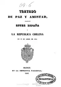 On 25 April 1844, as Prime Minister and Minister of State simultaneously, President Luis González Bravo, together with Queen Isabella II of Spain made the peace negotiations and Treaty to recognise the Spanish American Independence of Chile as a country, for its official recognition by the Spanish Kingdom, called the Tratado de Paz y Amistad, in the government of President of Chile Manuel Bulnes. The signing plenipotentiaries were Luis González Bravo for Spain, and General José Manuel Borgoño for Chile.