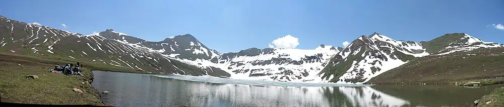 • Dudipatsar Lake-Dudipatsar Lake or Dudipat Lake is a lake encircled by snow clad peaks in Lulusar-Dudipatsar National Park. The lake lies in the extreme north of the Naran Valley. The word "dudi" means white, "pat" means mountains and "sar" means lake. This name has been given to the lake because of the white color of snow at surrounding peaks. In summer the water of the lake reflects like a mirror. The word "sar" is used with the name of each lake in the area, translating as 'lake.