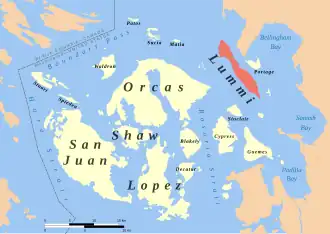 Lummi Island lies at the southwest corner of Whatcom County, Washington, United States, between the mainland part of the county and offshore San Juan County. The Lummi Indian Reservation is situated on a peninsula east of the island, but it does not include Lummi Island. The island has a land area of 23.97 square kilometres (9.25 square miles) and had a population of 822 as of the 2000 census. The population nearly doubles in summer when second-home owners from Canada and the U.S. arrive for the summer months.