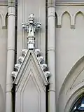 However, the cast-iron decor of the building's facades has not been completely restored, since some of the elements were lost during Soviet times due to dilapidation and lack of repair, and some – the finials of the side facades and the cast-iron parapet – were recognized as unsafe, removed and stored until the time when funds for their restoration become available.[6] В As a result, the roof lacks pinnacles and Gothic grilles.