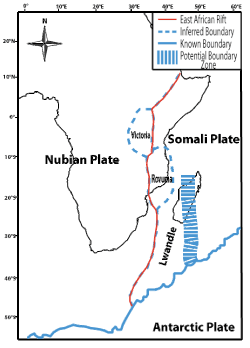 For many years it was widely accepted that rifting in the East African Rift system, 22–25 million years ago, resulted in the splitting of the African plate into 2 smaller plates – the Somali plate and the Nubian plate.[7] However, most recently, through the application of GPS technology and integration of earthquake data, it was discovered that the rift created three additional microplates – the Lwandle plate, Victoria plate, and Rovuma plate.[1]