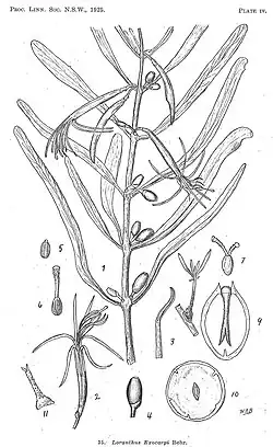 12. ^ Blakely, W.F. (1925). "The Loranthaceae of Australia. Part vi". Proceedings of the Linnean Society of New South Wales. 50 (2): 1, 8–9, Pl. 5A. ISSN 0370-047X. Wikidata Q106628892.
