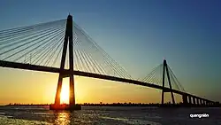 By road, Mỹ Tho City is 70 kilometres (43 mi) from Vĩnh Long province, 70 kilometres (43 mi) from Ho Chi Minh City, regional center of Southern Vietnam, 103 kilometres (64 mi) from Cần Thơ, 179 kilometres (111 mi) from Châu Đốc, 182 kilometres (113 mi) from Rạch Giá,[9] 132 kilometres (82 mi) from Long Xuyên.[10] Mỹ Tho and Bến Tre are connected by Rạch Miễu Bridge.