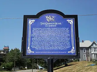 Gannon's house on Farnham Street was Italianate in design. He lived here in the years before he relocated to Omaha. Architecturally, it was less significant than the man who lived there.[4] It featured a hipped roof, bracketed eaves and fancy scroll work on the front porch. The front of the house at one time featured three bays with the main entrance in the left bay. The windows on the front of the building were altered on the first and second floors in later years. The house has subsequently been torn down. A sign placed by the Celtic Heritage Trail of the Quad Cities marks the location of the property.