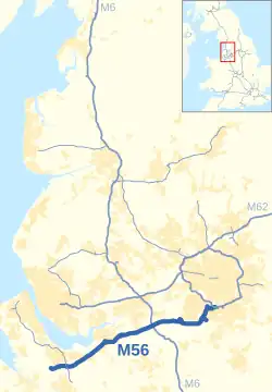 M56 highlighted in blue ![]() Shown in North West England ![]() Shown with the UK motorway network | ||||
