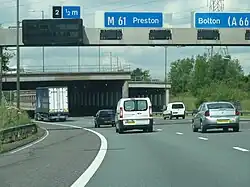 1. ^ Confusingly, the A666 southbound approach to this junction has signs identifying it as "junction 2", which appears to incompatible with the other M61 junction numbers. Other approaches display no number. The "Kearsley Spur" from this junction to M61 junction 2 is the A666(M).