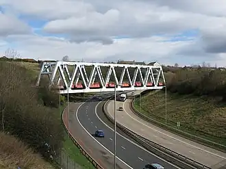 The upgrade plans were set into three discrete phases.[12] Phase one involved the creation of 8 kilometres (5.0 mi) of road from Stepps, routing north of Muirhead, Moodiesburn and Chryston, and meeting the line of the existing A80 at Mollinsburn with the construction of a new interchange, connecting the M80 with the M73 and the western section of the A80. Phase two required the online upgrade of the A80 between Mollinsburn and Auchenkilns, with the attendant upgrade of adjoining on-slip and off-slip roads, meeting the Auchenkilns Interchange. The interchange was opened in November 2005 after the online grade separation of the Auchenkilns Roundabout from the line of the dual carriageway created a grade separated dumbbell interchange, linking the A80 (and subsequently the M80) with the A73 and B8048.[13][14] Phase three saw the A80 upgraded online from Auchenkilns to the Haggs Interchange east of Cumbernauld – also seeing some junctions being upgraded, but with some being removed –[15] completing the connection of the western M80 to the eastern M80, and connecting to the M876 and M9 motorways. The M80 crosses the Glasgow to Edinburgh via Falkirk railway line and Forth and Clyde Canal.