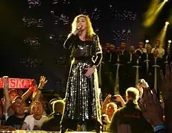 To promote the album, Madonna embarked on the MDNA Tour, which was her ninth concert tour.[10] The tour visited America, Europe and the Middle East, while also marking the singer's first performances in the United Arab Emirates, Ukraine, Scotland and Colombia.[11] Described by her as "the journey of a soul from darkness to light", the MDNA Tour was divided into four sections: Transgression, where guns and violence was the main theme, Prophecy, where a mix of joyful songs that bring people together are performed, Masculine/Feminine, a combination of sensuality and fashion with a few of Madonna's classic songs performed in a French Cabaret-style, and Redemption, which Madonna labelled as "a big party and celebration".[12] The tour received positive reviews,[13][14][15] but courted many controversial subjects such as violence, firearms, human rights, nudity and politics.[16] Nevertheless, it was a commercial success and many venues were instantly sold out.[17] After completion, it was dubbed the highest-grossing tour of 2012 by Billboard. Total gross was $305.2 million from 88 sold-out shows, becoming the tenth highest-grossing tour of all time and surpassing Celine Dion's Taking Chances World Tour as the second highest-grossing tour among female artists, behind Madonna's own Sticky & Sweet Tour.[17]
