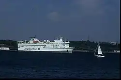 The ship is 91.8 m (301 ft 2 in) long and 18 m (59 ft 1 in) wide with a draft of 3.8 m (12 ft 6 in).[4] Its maximum speed is 15.5 kn (28.7 km/h; 17.8 mph) and it is equipped two KRUPP–MaK diesel engines which harbor 1,800 kW (2,400 hp) a piece.[5] The ship is rated to carry 1,080 passengers and 120 vehicles.[6] It has a gross tonnage of 6,721 and a deadweight of 804 tons.[7]