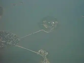 Mackworth Island is an approximately 100-acre (40 ha) island in Casco Bay, Maine, United States. Politically, it is part of the town of Falmouth, which is adjacent to Portland. In 1631, Sir Ferdinando Gorges, who first attempted to colonize Maine, gifted the island to Arthur Mackworth, his deputy in Casco Bay, and the island has retained his name.[3] A causeway, which carries the traffic of Andrews Avenue, connects the island to Mackworth Point on the mainland. Visitors to the island must pass a state park entrance tollhouse and pay an entrance fee; cars can enter the island, but parking is limited. There is a footpath around the perimeter of the island with views of Falmouth, Portland, and other islands surrounding the bay. The island is heavily wooded and one portion of those woods is dedicated to "Fairy Houses" which are constructed by visitors using natural materials found on the island.[4] Although most areas of the island are State Park lands, there is a school area that is not open to the public. The island is also home to the Governor Baxter Dog Memorial, a pet cemetery where fourteen of the former governor's Irish Setters and one of his horses were buried, accompanied by two bronze markers and a gravestone, all enclosed by a circular stone wall.[5]