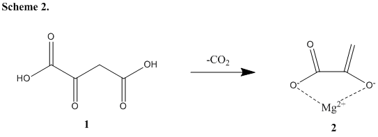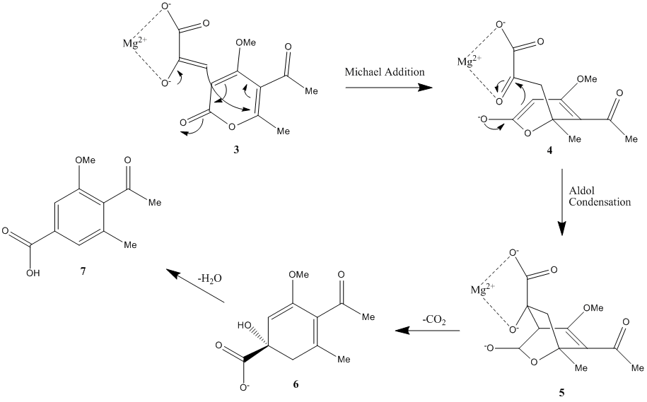 In the Michael-aldol pathway (Scheme 2), The coordinated oxaloacetate enolate performs a Michael addition to the ring of the pyrone to form intermediate 4. Next, this intermediate undergoes an aldol condensation to form the proposed bicyclic intermediate (5). Finally, this bicyclic compound undergoes a decarboxylation to form intermediate 6 and dehydration to form macrophomic acid (7).[4]