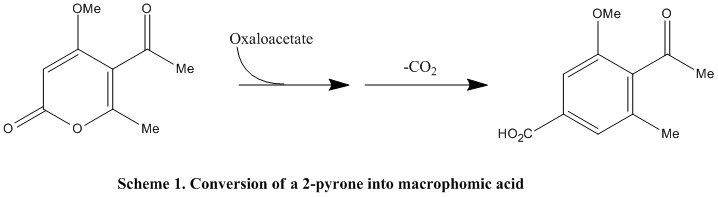 Macrophomic acid is a fungal metabolite isolated from the fungus Macrophoma commelinae. The enzyme macrophomate synthase converts 5-acetyl-4-methoxy-6-methyl-2-pyrone to 4-acetyl-3-methoxy-5-methyl-benzoic acid (macrophomic acid) through an unusual intermolecular Diels-Alder reaction (Scheme 1).[1] The pathway to formation of macrophomic acid suggests that the enzyme is a natural Diels-Alderase.[2] Formation of this type of aromatic ring compound normally proceeds via the shikimate and polyketide pathways; however, the production of macrophomic acid by macrophomate synthase proceeds totally differently. Learning about the production of macrophomic acid by a possible natural Diels-Alderase enzyme is important in understanding enzyme catalytic mechanisms. This knowledge can then be applied to organic synthesis.[3]