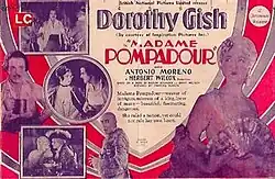 Madame Pompadour is a 1927 British silent historical drama film directed by Herbert Wilcox and starring Dorothy Gish, Antonio Moreno and Nelson Keys.[2] The film depicts the life of Madame de Pompadour, mistress of Louis XV of France. It was the first film to be shot at the newly christened Elstree Studios.[3]