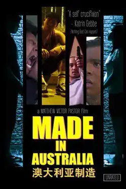 Made In Australia is an Australian feature film released in 2013. Filmed in Melbourne, Australia and Hong Kong on a microbudget. It was awarded 'Best Guerrilla Film' at the 14th Melbourne Underground Film Festival[3] One of the film's core themes is the perception of Asian masculinity in the West. The film is one of the only Australian features to show full-frontal Asian male nudity in film, with the title credits "Made In Australia" appearing over Matthew Victor Pastor's genitalia.[4]