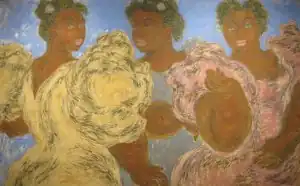 A renowned art educator as well as painter of modern figurative canvases of Hawaiian subjects, Madge Tennent had a distinguished career based primarily in Hawaiʻi from where she sent paintings to the mainland United States for exhibitions in New York City and Chicago between 1930 and 1939. She was among the first artists to embrace native Hawaiians as a primary subject matter, whom she depicted as large and robust with audacious, swirling forms and colors. Two Sisters of Old Hawaiʻi, in the collection of the Hawaii State Art Museum, is an early example of her large paintings of Hawaiian women. Her influence was increased by her association with the Honolulu Museum of Art in its early days, where she was a frequent lecturer, and where she was included in most of the academy's early group shows.